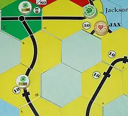 - La carte est généralement une grille hexagonale qui représente des villes et des reliefs. Des tuiles "voies ferrées" hexagonales (représentant les droits fonciers disponibles) sont posées au-dessus de cette carte pour représenter la croissance des réseaux ferroviaires, et des jetons sont placés sur le plateau pour représenter les gares (ainsi que les capacités spéciales des entreprises privées). Les villes ont des valeurs qui peuvent varier en fonction des tuiles qui y sont posées, de la phase de jeu ou même du type de train utilisé pour les atteindre. Différentes tuiles de couleurs sont disponibles successivement et selon la phase du jeu. Le passage d'une phase à l'autre est généralement déterminé par le premier achat d'un type de train plus avancé.