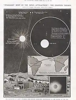 - 29 mai : lors d'une éclipse totale de soleil sur l'Île de Principe, l'expédition dirigée par l'astronome et physicien britannique Arthur Eddington mesure une déflexion de la lumière des étoiles par le soleil, exactement conforme aux prédictions de la relativité générale, c'est-à-dire la déviation gravitationnelle de la lumière (décalage d'Einstein)[6]. La preuve de la relativité générale est présentée le 6 novembre à Londres, dans la Burlington House, lors d'une séance présidée par Sir Joseph John Thomson, Prix Nobel de physique en 1906[7].