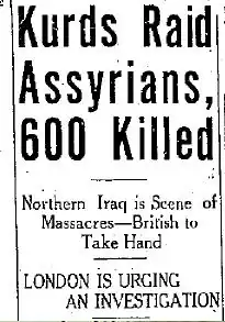 - Juillet - août : Les communautés chrétiennes d’Irak entrent en conflit avec le gouvernement à majorité arabe, qui tente de les ramener sous son contrôle direct. Dans la nuit du 14 au 15 juillet, un millier de chrétiens assyriens, armés, entrent en Syrie, entraînant la réaction de l’armée française[42]. Du 7 au 15 août les forces irakiennes du général Bakr Sidqi attaquent les villages chrétiens et massacrent leurs habitants, causant la fuite d’une partie de la population en Syrie[43]. Ceux qui restent cessent toute revendication et seront assimilés dans la population irakienne.