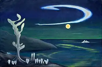 L'Étrange K de Monsieur K, huile sur toile. André Breton: «La grande marmite nocturne et immémoriale gronde au loin et à chaque coup de gong frappé - c'est son couvercle qui bat - glissent par l'entrebâillement toutes sortes d'êtres et d'objets douteux qui se répandent dans la campagne mentale.»[39]