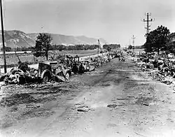 massacre d'Oradour-sur-Glane par mesure de représailles après une attaque menée par des maquisards. Les soldats de la 2edivision SS Das Reich du général Lammerding enferment 642 habitants du village dans six granges et dans l'église et les font brûler vifs à coup de lance-flammes[56].
