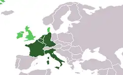 Abkhazie, Allemagne, Albanie, Andorre, Arménie, Autriche, Azerbaïdjan, Belgique, Biélorussie, Bosnie-Herzégovine, Bulgarie, Caucase, Chypre, Croatie, Danemark (), Espagne, Estonie, Finlande, France (Bretagne, Lorraine et Nouvelle-Calédonie), Géorgie, Grèce, Hongrie, Irlande, Islande, Italie, Kazakhstan, Kosovo, Lettonie, Liechtenstein, Lituanie, Luxembourg, Macédoine du Nord, Malte, Moldavie, Monaco, Monténégro, Norvège, Ossétie du Sud-Alanie, Pays-Bas, Pologne, Portugal, Roumanie, Royaume-Uni (), Russie (), Saint-Marin, Serbie, Slovaquie, Slovénie, Suède, Suisse, Tchéquie, Turquie, Ukraine et Vatican Océanie