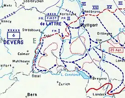 De Freundenstadt, des éléments de la 1re DB poussèrent à l'Est et au Sud, prenant Ulm le , puis poussèrent au Sud à nouveau avec des éléments de la 2e DIM vers les Alpes, traversant l'Autriche et marchant sur Sankt-Anton le . Des éléments de la 5e DB et de la 4e DMM roulèrent vers le sud-est le long de la rive nord du lac de Constance, capturant Brégence et tournant ensuite vers l'Est en direction de Sankt-Anton. Le jour suivant fut le 8 mai 1945, qui mit fin aux opérations militaires Alliées en Europe.