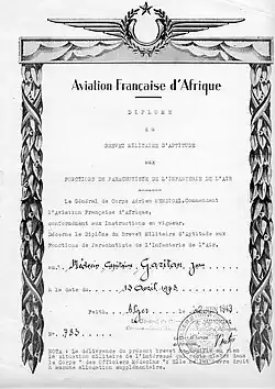• En , la commission d'armistice autorise la formation de la compagnie d'infanterie de l'air no 1 à Oued-Smar, base de Maison-Blanche près d'Alger, à partir d'effectifs des deux GIA dissous (à ne pas confondre avec une autre unité portant un nom voisin, créée en Angleterre sur instruction du général de Gaulle en et placée sous les ordres du capitaine Georges Bergé : la 1re compagnie d'infanterie de l'air).