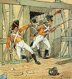 « […] la résistance fut opiniâtre. Le régiment se déploie, fait des feux de peloton, marche en avant, fait halte, recommence un feu de file qu'il cesse, pour faire demi-tour et se retirer au pas ordinaire. Il s'arrête encore, fait face en tête, recommence le feu […][10],[8]. »