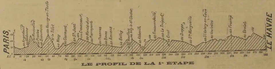 Les coureurs s'élancent depuis le pont d'Argenteuil à Paris et rejoignent Le Havre en Seine-Inférieure, au terme d'un parcours de 388 kilomètres.