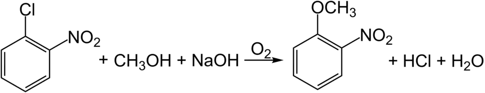 Lorsque le 2-chloronitrobenzène interagit avec 80-90% de méthanol aqueux à 95-110 °C, pendant 4 à 8 heures, en présence d'air ou d'oxygène et d'alcali, on obtient du 2-nitroanisole :
