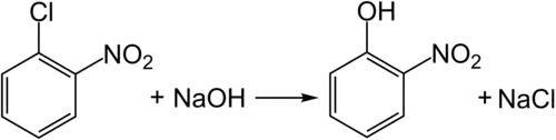 La présence d'un groupe nitro dans le noyau benzénique facilite les réactions de substitution nucléophile, mais pas au point que, par exemple, il soit facile de remplacer un atome de chlore par une solution aqueuse alcaline à pression normale. Dans des conditions plus sévères, la réaction continue avec la formation de 2-nitrophénol :