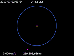 - ↑ (en) Caractéristiques et simulation d'orbite de 2014 AA dans la JPL Small-Body Database.