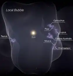 - ↑ Catherine Zucker, Alyssa A. Goodman, João Alves, Shmuel Bialy, Michael Foley, Joshua S. Speagle, Josefa Groβschedl, Douglas P. Finkbeiner, Andreas Burkert, Diana Khimey et Cameren Swiggum, « Star formation near the Sun is driven by expansion of the Local Bubble », Nature, vol. 601, (DOI 10.1038/s41586-021-04286-5)