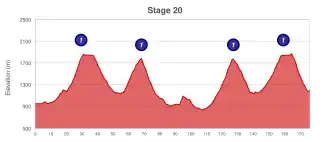 La vingtième étape est la dernière étape de montagne de cette Vuelta. Elle comprend quatre ascensions de première catégorie, en 175,8 km de course. Partant de San Lorenzo de El Escorial, le parcours se dirige vers le nord et atteint une première fois Cercedilla, sans passer par la ligne d'arrivée, après 17 km. La course poursuit sa route vers le nord où se trouve la première difficulté du jour, le Puerto de Navacerrada (9,4 km d'ascension à 6,6%). Après un court plateau et une descente abrupte, les coureurs escaladent le versant nord du Puerto de la Morcuera (11,5 km à 5,4%). Après une nouvelle descente raide, une boucle de quarante kilomètres de plaine amènent les coureurs sur le même parcours, en sens inverse. Ils empruntent ainsi le versant sud du Puerto de la Morcuera (10,4 km à 6,6%). Après la descente, ils atteignent la dernière ascension du jour, le Puerto de Cotos (11 km à 5,3%). À 17,8 km, ils reviennent sur le plateau, suivi de la descente vers Cercedilla.