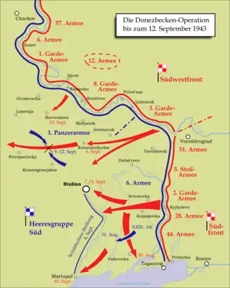 Le front du Sud lance sa première tentative pour briser la ligne du Mious le 17 juillet alors que la bataille de Koursk touche à sa fin, mais après de nombreux combats allers-retours coûteux, il suspend ses efforts le 27 juillet, bien que les contre-attaques allemandes se poursuivent jusqu'au 2 août. Une nouvelle offensive commence le 13 août et, bien que le front du Sud-Ouest au nord soit initialement incapable de pénétrer le front de la 1re armée Panzer au sud d'Izium, le front du Sud perce, à partir du 18 août, à travers la 6e armée allemande reconstruite. La 5e armée de choc, avec une concentration écrasante, notamment d'artillerie, sur un front étroit, perce sur une profondeur de 7 km et une largeur de 3 km. À la lumière de la pleine lune, l'armée s'étend au nord et au sud derrière le front de la 6e armée. Les efforts allemands pour réduire le saillant soviétique le 20 août obtiennent quelques progrès initiaux, mais échouent en raison d'une forte réaction soviétique. Le 23 août, la 1re armée Panzer est également en difficulté avec son corps d'armée au sud d'Izioum réduit à une force de combat de seulement 5 800 hommes et incapable de tenir une ligne continue. Le 31, le maréchal von Manstein est finalement autorisé à retirer les deux armées vers la rivière Kalmious, commençant ainsi la course vers le Dniepr[5]. Plus tard en août, la 221e division est transféré à la 44e armée, toujours sur le front sud. À l'époque, cette armée n'avait sous commandement que la 221e, la 130e division de fusiliers (ru) et la 1re région fortifiée de la Garde (en) en tant que forces d'infanterie[6]. Au fur et à mesure que l'avancée se poursuivait, la division reçoit son premier titre honorifique pour la libération de Marioupol le .