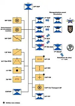 Outre sa composante aéroportée, qui comprend dorénavant deux régiments de parachutistes et un régiment aéroporté par planeurs CM 10[3], la 24e DAP dispose également d'éléments de quartier général et d'unités d'appui et de soutien.