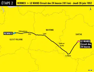 La 2e étape du Tour de France 1952 s'est déroulée le entre les villes de Rennes, qui accueille le Tour pour la sixième fois, et Le Mans, première fois ville-étape du Tour de son histoire. Le parcours traverse les départements d'Ille-et-Vilaine, de la Mayenne et de la Sarthe sur une route principalement plane et longue de 181 km. Il passe notamment par les villes de Vitré, Laval, Sablé-sur-Sarthe et La Flèche.