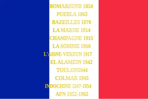 Bomarsund 1854 Puebla 1863 Bazeilles 1870 Tuyen-Quan 1885 La Marne 1914 Champagne 1915 La Somme 1916 L'Aisne-Verdun 1917 Kub Kub 1941 El Alamein 1942 Takrouna 1943 Ponté Corvo 1944 Toulon 1944 Colmar 1945 Indochine 1947-1954 AFN 1952-1962 |