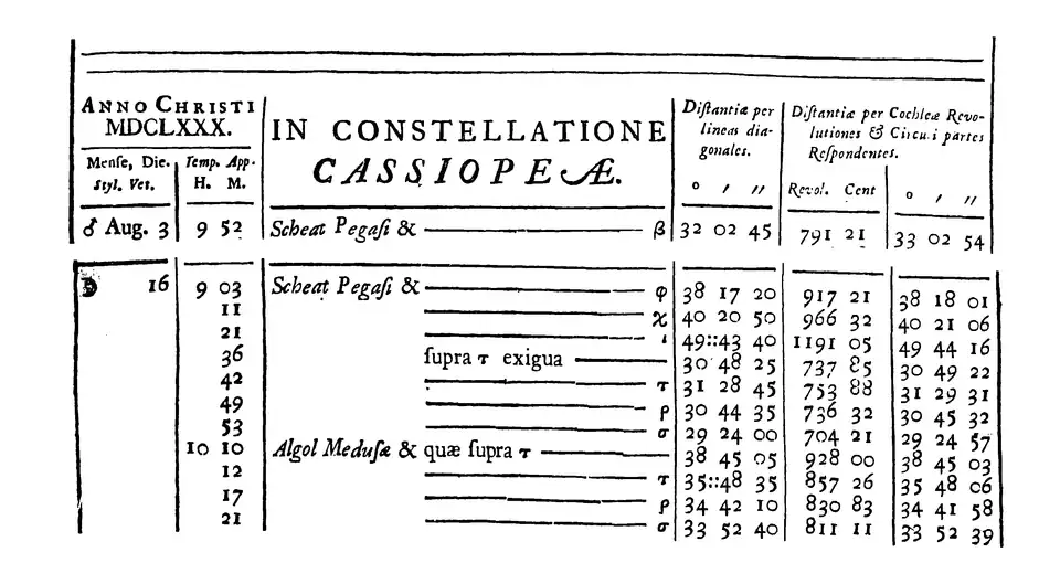 C'est au mois d' que Flamsteed entreprend le recensement des étoiles de la constellation de Cassiopée, tâche qu'il répartira sur quatre jours, les 13, 17, 26 et 28 de ce mois. Lors de ses observations, Flamsteed mesurait la distance angulaire entre les étoiles observées et diverses étoiles de référence, et en déduisait par la suite les coordonnées (ascension droite et déclinaison) sur la sphère céleste. Cette façon de procéder possédait l'avantage qu'il n'était pas nécessaire d'attendre le passage d'une étoile au méridien pour mesure sa déclinaison, ou de connaître précisément l'heure de passage au méridien pour en déduire son ascension droite, mais nécessitait bien sûr que la position des étoiles de références fût connue, elle, avec précision.