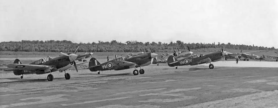 Une action typique de l'Escadron en 1944: « Le 10 septembre a produit quatre missions. À 15 h 20, le commandant de l’Escadron, le Squadron Leader Beirnes a mené neuf Typhoons dans la région de Turnhout-Venlo-Eindhoven pour mitrailler quatre trains comptant de 10 à 20 wagons chacun. Dans chaque cas, la locomotive a été détruite. Le vol a atterri à 16 h 30 et a décollé à nouveau à 19 h 30, cette fois avec des bombes de 500 livres pour faire sauter des navires à Hoedekenskerke. Toutes les bombes frappèrent leurs cibles, touchant des navires ou des quais. Un navire, apparemment porteur de munitions, a explosé de façon spectaculaire et un second a été laissé en flammes. »