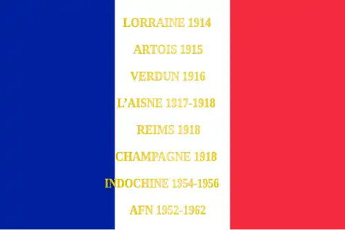 - ↑ Décision no 12350/SGA/DPMA/SHD/DAT du 14 septembre 2007 relative aux inscriptions de noms de batailles sur les drapeaux et étendards des corps de troupe de l'armée de terre, du service de santé des armées et du service des essences des armées, Bulletin officiel des armées, no 27, 9 novembre 2007