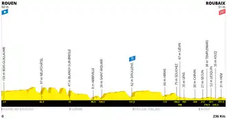 La première partie commence à la sortie du Rouen, avant de prendre la route nationale en direction de Neufchâtel-en-Bray et de traverser le Pays de Bray. La première difficulté arrive après Saint-Martin-Osmonville (km 28) avec une côte de 1,8 km à 4 % de dénivelé moyen. Viennent ensuite une côte de 5 km à 3 % après Neufchâtel-en-Bray (km 42), une côte de 2 km à 5 % entre Ménonval et Vatierville (km 51), une côte de 2 km à 4,5 % après Fallencourt (km 63) et enfin une côte d'1,9 km après Blangy-sur-Bresle (km 73). Le dénivelé cumulé total sur cette portion est d'environ 1 100 mètres sur 138 km[5],[6]. Plusieurs sections pavées sont présentes sur le tronçon, dont la traversée de Neufchâtel-en-Bray, d'Abbeville ainsi que celle de Blangy-sur-Bresle[3].