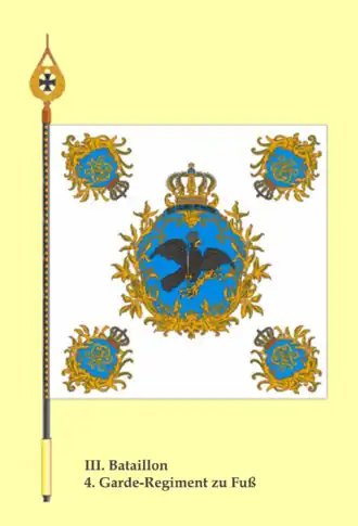 Les drapeaux du régiment sont constitués d'un tissu de soie blanche carrée de quatre pieds sur six pouces de long. Au centre se trouve l'inscription « Pro Gloria et Patria (de) » en or et un aigle prussien noir entouré de laurier et couronné d'une couronne d'or. Sur chacun des quatre côtés, il y a une grenade dorée et enflammée et dans chaque coin le nom royal « FWR », entouré de lauriers verts et argentés. Chaque bataillon reçoit un tel drapeau selon l'A.K.O. du 15 octobre 1860, et ils sont consacrés le 18 janvier 1861 à Berlin.