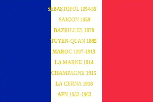 Sébastopol 1854-55 Saïgon 1859 Bazeilles 1870 Tuyen-Quan 1885 Maroc 1907-1913 la Marne 1914 Champagne 1915 la Cerna 1916 AFN 1952-1962 |