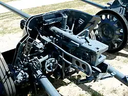 Vue de face d'un canon Pak 38 monté sur châssis de Panzer II. À noter, l'ajout artisanal de plaque de blindages supplémentaires sur le bouclier du canon (Russie, ).- Vue de la culasse.