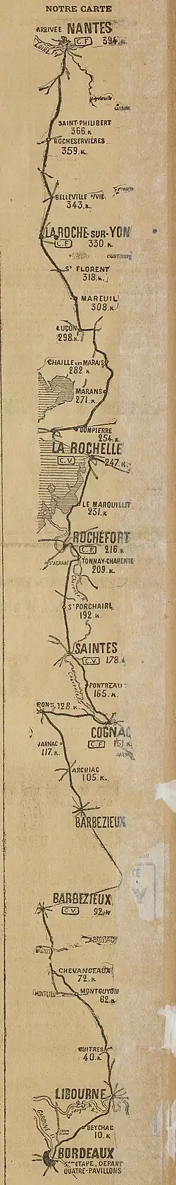 À noter les modifications du parcours dans L'Auto du [2], § « L'itinéraire définitif avant Nantes » et dans L'Auto du [1], §§ « À La Rochelle », « À Saintes » et « Modification d'itinéraire avant Nantes ».