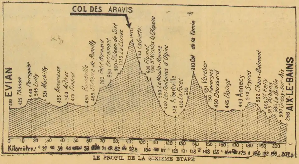 - ↑ Henri Desgrange, « En tête par 4 secondes en haut des Aravis, René Vietto gagne la 6e étape à Aix-les-Bains avec près de 4 minutes d'avance ! », L'Auto, no 12625, , p. 1 (lire en ligne).