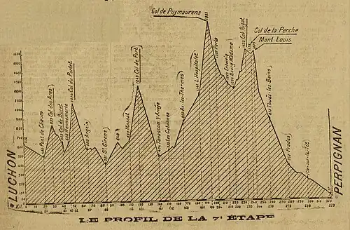 Excellent grimpeur, le Français Honoré Barthélémy, trop éloigné au classement général après avoir perdu du temps les premiers jours, passe de nouveau à l'offensive dans la septième étape et franchit seul le col de Puymorens. Une crevaison ruine ensuite ses espoirs. À l'avant, Eugène Christophe et Firmin Lambot se marquent, accompagnés par Jean Alavoine. Ce dernier, meilleur finisseur, l'emporte au sprint à Perpignan[2].