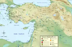 - Printemps, Asie mineure : Nicomède IV de Bithynie, poussé par le légat Aquilius qui vient de le rétablir sur son trône, ravage la Paphlagonie pontique pour payer ses protecteurs romains, ce qui déclenche la première guerre de Mithridate[4]. Mithridate VI, roi du Pont, après l’échec de négociations avec Rome, occupe la Cappadoce pour y rétablir son fils Ariarathe IX, et après deux victoires décisives, l'une sur Nicomède sur la rivière Amnias, l’autre sur Aquilius à Protopachion, occupe la Bithynie[5].