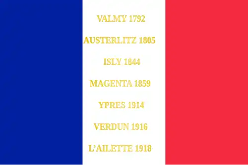 - ↑ Décision no 12350/SGA/DPMA/SHD/DAT du 14 septembre 2007 relative aux inscriptions de noms de batailles sur les drapeaux et étendards des corps de troupe de l'armée de terre, du service de santé des armées et du service des essences des armées, Bulletin officiel des armées, no 27, 9 novembre 2007