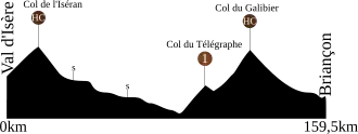 Les coureurs doivent franchir deux cols hors catégorie, le col de l'Iseran (2 770 m) en début d'étape et le col du Galibier (2 645 m) en fin d'étape via le col du Télégraphe (1 566 m), avant de terminer l'étape par une longue descente jusqu'à Briançon.