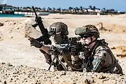 - les actions amphibies : projection avec préavis court d’un état-major et d’un bataillon renforcé (1 400 hommes) par des moyens maritimes militaires, tels que les porte-hélicoptères amphibie (PHA).