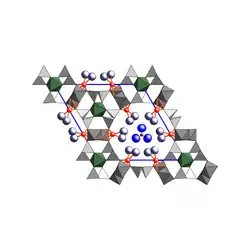 Tous les canaux H2O-CO3 sont reliés via les chaînes Al-octaèdre avec six autres canaux H2O-CO3 et connectés à six chaînes octaédriques Fe par l'intermédiaire des chaînes tétraédriques de silicate.