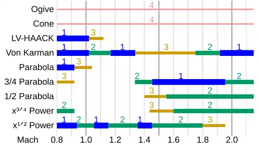 Dans de nombreuses conceptions de pointe avant, la plus grande préoccupation est la performance dans la plage transsonique de 0,8 à 1,2 Mach. Bien que les données ne sont pas disponibles pour de nombreuses formes dans la région transsonique, le tableau montre clairement que soit la forme de Von Kármán, ou celle obtenue avec la fonction puissance avec n = 1/2, serait préférable aux célèbres pointes avant coniques ou en ogives.