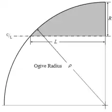 Le rayon de l'arc de cercle qui forme l'ogive est appelé rayon de l'ogive et est lié à la longueur et la largeur de la pointe avant par la formule: