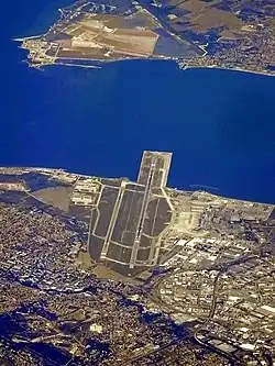 L'aéroport Marseille-Provence, au bord de l'étang de Berre, vu du ciel.