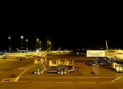 - Deux terminaux équipés[15] de 22 passerelles télescopiques d'embarquement direct et 80 postes hors passerelles :