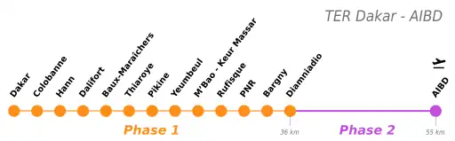 Schéma de la ligne du TER qui devrait relier l'aéroport à la ville de Dakar en 2024 / 2025 :