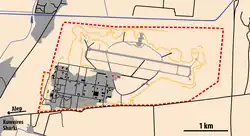 Aéroport de Kuweires en 2014, limites de la base en pointillés rouges, fortifications en orange, hangars des aéronefs en rouge, bâtiments en noir