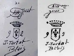 Après le changement d'activité de Josaphat Tortat et son départ de Blois en 1891[14], Arthur Just continue à produire quelques faïences en utilisant les stocks de formes de l'atelier et en ayant recours à un four de location. La notoriété de Josaphat Tortat reste telle qu'Arthur Just choisit de conserver sur ses productions la marque J. Tortat à laquelle il adjoint à partir de 1892 une annotation A.W. Just S puis A.W. Just Seur[15] en tête de marque.