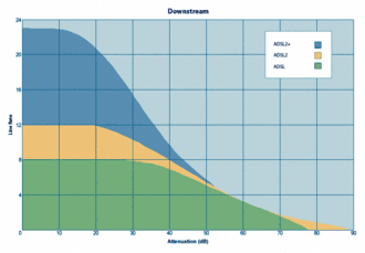 Atténuation du débit de l'ADSL2+ (en bleu) par rapport à l'ADSL2 (en orange) et à l'ADSL (en vert). Le débit (line rate) est le débit ATM.