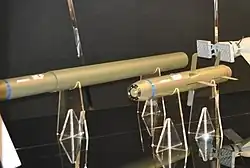 Exposition d'un missile AKERON MP (anciennement appelé MMP) au Salon aéronautique de Dubaï de 2021. | |