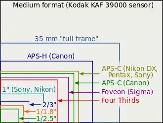 - ↑ Les capteurs de dimensions 28,7 × 19,1 mm sont appelés APS-H, leur coefficient de conversion est de 1,25, mais il est habituellement arrondi à 1,3