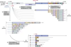 Un ARN sous-génomique, ou ARNm sous-génomique, est un ARN messager issu de la transcription d'une fraction plus ou moins grande d'un brin d'ADN ou d'ARN antisens. Ce type d'ARN messager est produit essentiellement par des virus, notamment des virus à ARN de polarité positive[1] (groupe IV de la classification Baltimore). Ainsi, chez les nidovirus, La transcription commence à l'extrémité 3’ du génome, se poursuit avec un plus ou moins grand nombre de nucléotides, puis « saute » vers l'extrémité 5’ pour terminer la transcription[2]. Ce mécanisme produit des ARN messagers ayant une extrémité 5’ plus ou moins constante, selon la longueur du segment transcrit avant de poursuivre la transcription de l'extrémité 3’[3]. Ces ARN sous-génomiques forment des ensembles ayant des séquences imbriquées, ce qui constitue un moyen de coder plusieurs protéines sur le même génome[4].