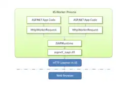 Le moteur d'ASP.NET est un filtre, branché sur le service web IIS par son interface de programmation ISAPI[3]. Le filtre — une DLL — est chargé en mémoire à la première utilisation, puis pour chaque demande de page web il lit un modèle de page, puis exécute des instructions qui vont altérer le contenu de la page et renvoie le résultat à IIS, qui le transmet au client[3].