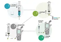 - Large gain en sensibilité de la mesure. Grâce à cette étape, l’ATPmétrie a pu être utilisée pour le contrôle des eaux ultra-pures[6].