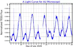 AU Microscopii a été observée dans tous les domaines du spectre électromagnétique, de la radio jusqu'aux rayons X et elle est connue pour avoir une activité éruptive à toutes ces longueurs d'onde[16],[17],[18],[19]. Son caractère éruptif a été identifié en 1973[20],[21]. En plus de ces éruptions aléatoires, il y a une variation presque sinusoïdale de sa luminosité avec une période de 4,865 jours. L'amplitude de cette variation change lentement au cours du temps. La variation de luminosité en bande V était d'environ 0,3 magnitude en 1971 ; en 1980, elle était de presque 0,1 magnitude[22].