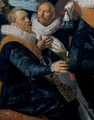 Cette date est déroutante pour les historiens d'art, les catalogues du musée Frans Hals prétendant qu'il est assis dans un portrait de groupe d'une schutterij de Frans Hals, Le Banquet des officiers de la Compagnie de la milice Saint -Georges (en), peint dix ans plus tard.