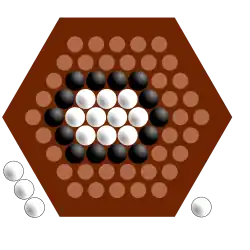 - Chaque joueur dispose de 14 billes disposées sur qui sont placées au départ selon la position indiquée dans les règles (sur 3 rangées).